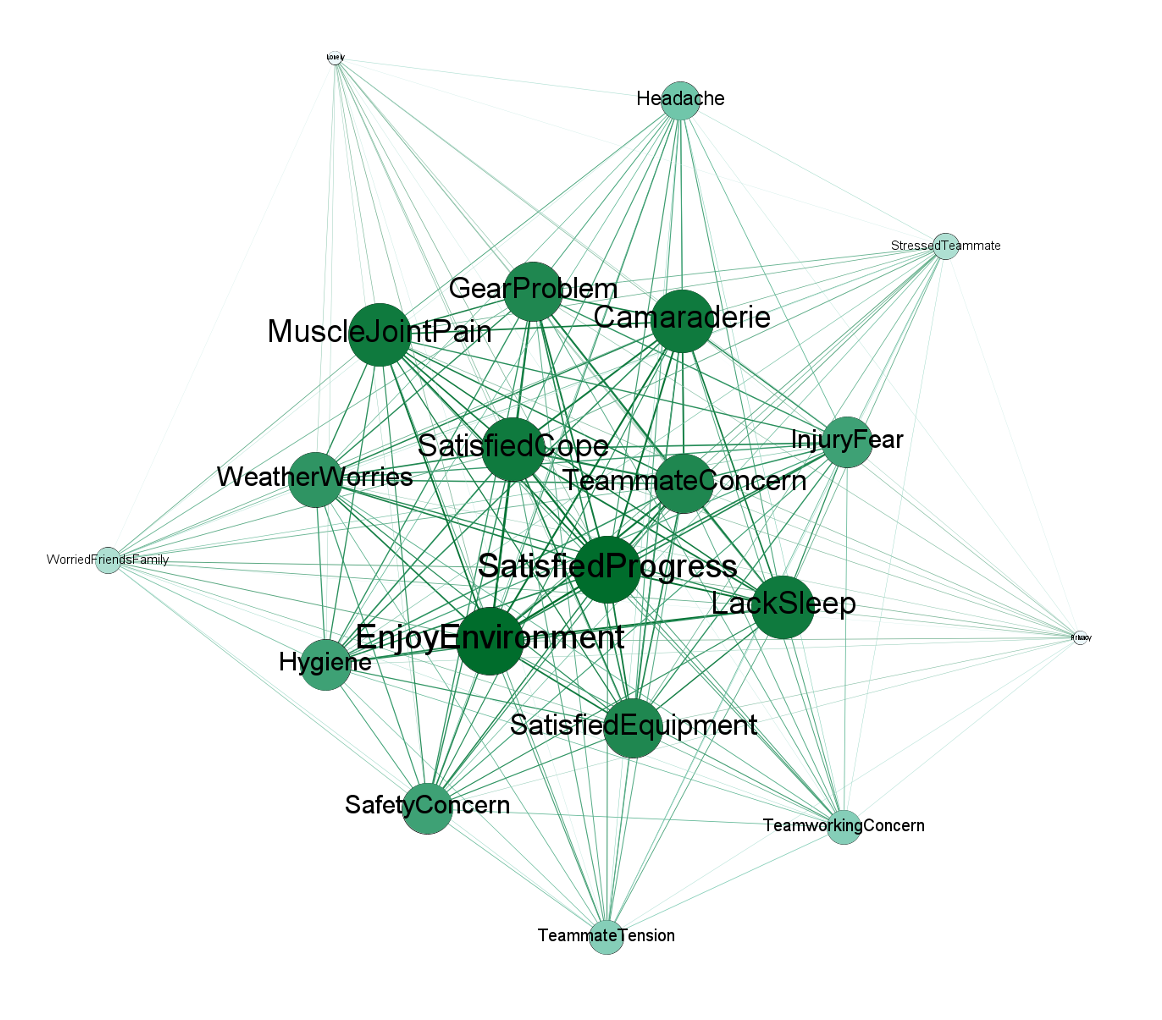 Well, these things seem to be important in isolated, confined and extreme settings too. Take a look at the network analysis below. This is based on descriptive data that colleagues and I have been collecting from expedition team members for a number of years now. Here we have daily data from 42 people (nearly 1000 days in total) taking part in different types of expedition journey (crossing polar icecaps, trekking through deserts and so on). The nodes nearer the middle represent stuff that is happening a lot. Lines show the connections between experiences (in the present case, the thicker the lines the greater the co-occurrence).
